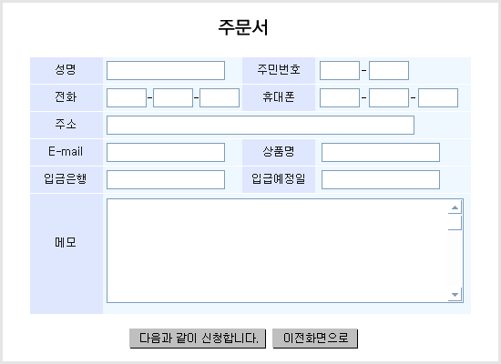 주문서의 입력폼은 아래와 같습니다. 폼에 입력을 하고 주문하기 버튼을 누르면 관리자 이메일로 주문내역이 발송됩니다.