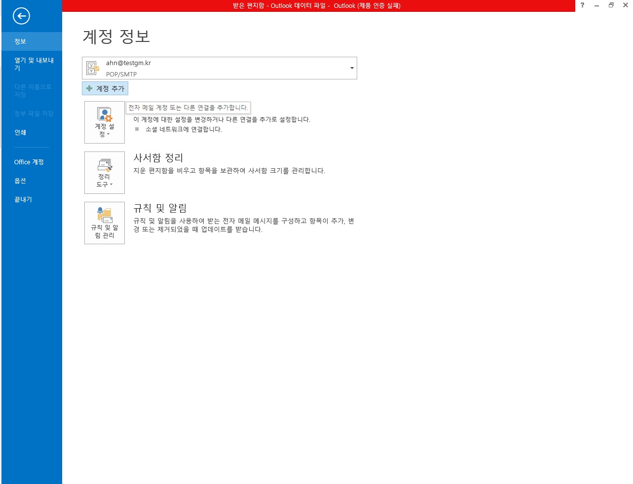 - 메뉴에 있는 파일 -> 정보 -> 계정 추가에 들어갑니다.