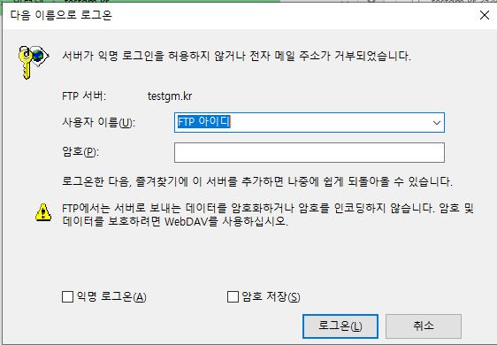 발급받은 FTP 계정 아이디와 암호를 입력한 뒤 [로그온] 버튼을 클릭하면 고객님의 계정에 접속됩니다. |