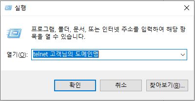 윈도우 시작 > 실행을 클릭한 후 입력창에 telnet 도메인명 을 입력하고 "확인"버튼을 클릭합니다.