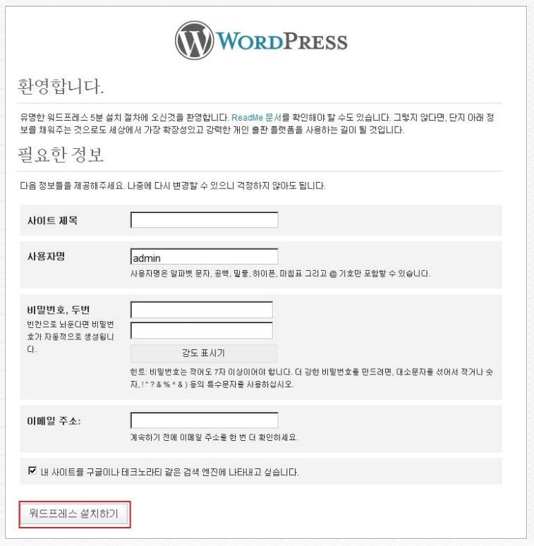 아래와 같은 화면이 나오면 사이트 정보 입력후 [워드프레스 설치하기]를 클릭하시면 됩니다.