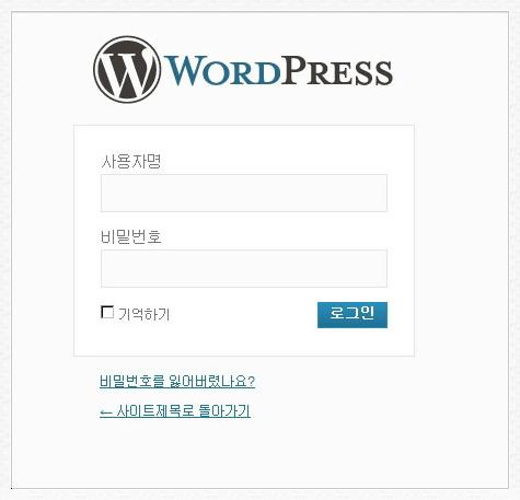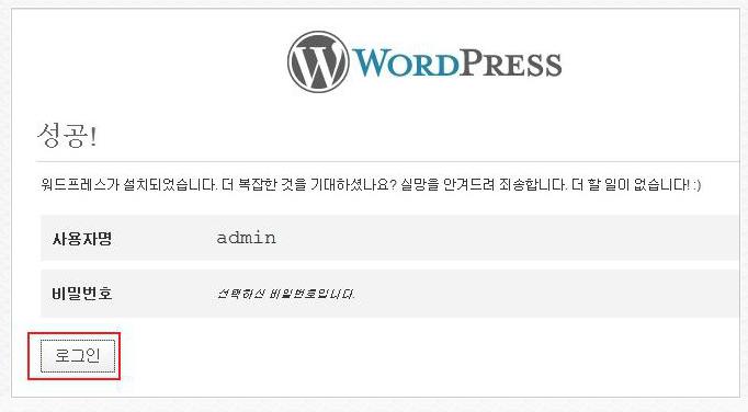 아래와 같이 설치 화면이 나오면 [로그인]을 클릭 후 관리자 정보를 입력하시면 워드프레스 관리자 화면으로 로그인이 가능합니다.