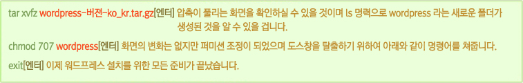 워드프레스는는 .zip 파일과 .tar.gz 파일 2가지로 배포되고 있습니다. 리눅스에서 셸 명령어를 아시는 분은 .tar.gz 파일을 받아서 계정에 올린 후 압축을 푸는 것이 쉽고, 리눅스를 잘 모르시는 분들은 .zip 파일을 다운로드 받으시는 것이 좋습니다. |