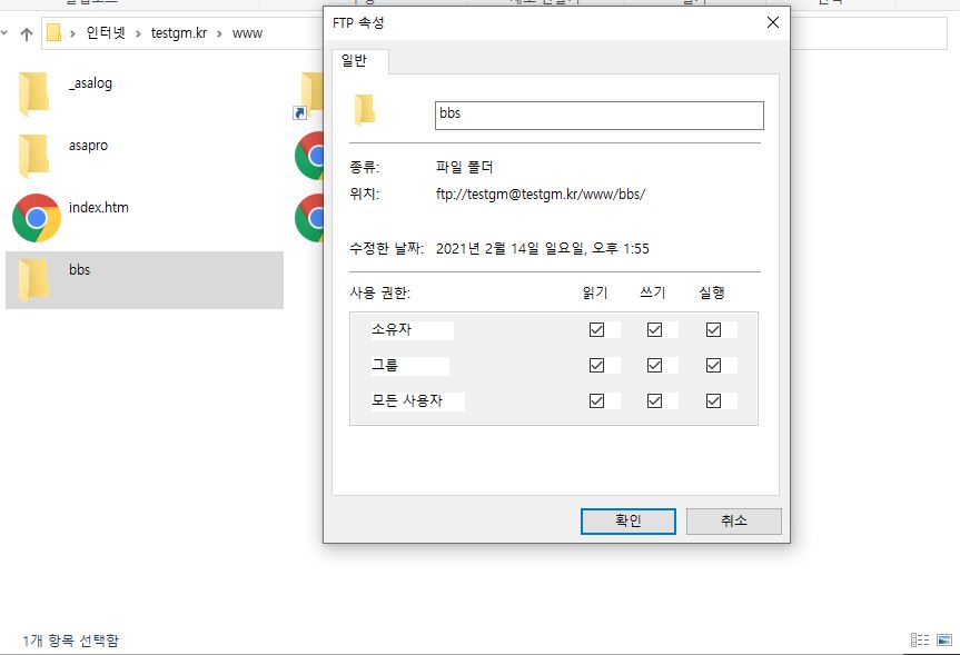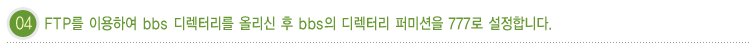 “FTP 계정에 접속> bbs 디렉터리 선택 > 오른쪽 마우스 클릭 > 속성 선택”을 하면 아래 그림과 같이 사용 권한 부분이 나옵니다. 사용 권한 부분을 모두 체크한 후 확인 버튼을 클릭하십시오.