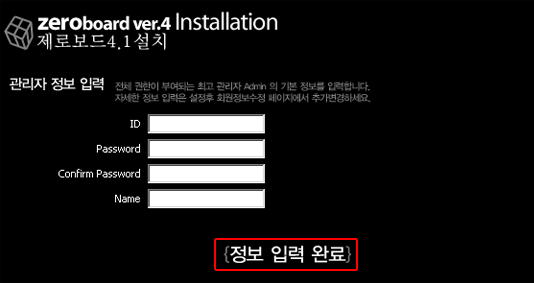 MySQL DB 입력이 정상적으로 이루어졌다면 아래와 같이 기본으로 이용될 최고 관리자 정보 입력화면이 나옵니다.