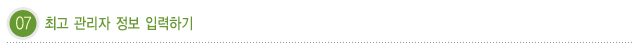 • 지금 입력하시는 관리자 ID는 계속 사용해야 하며, 분실 시 관리자 화면으로 들어갈 수 없으니 꼭 기억하시기 바랍니다.