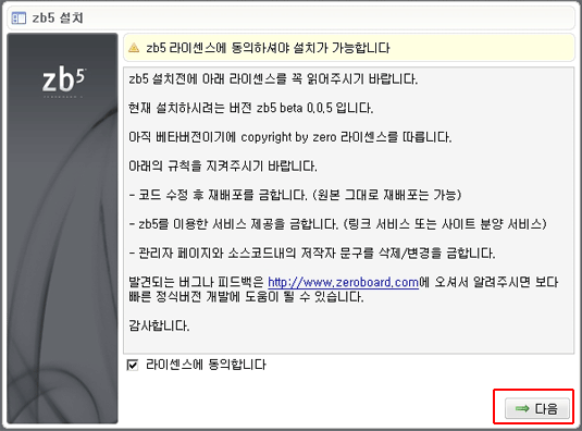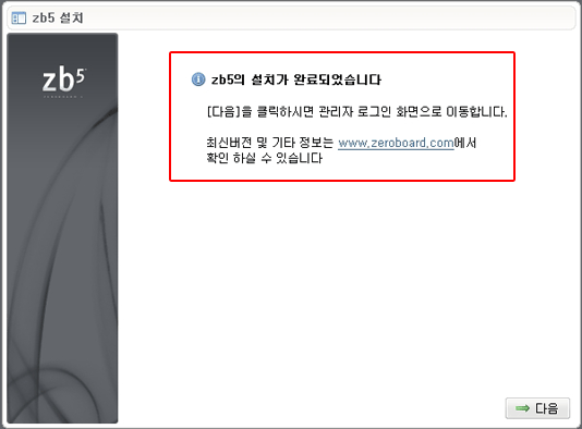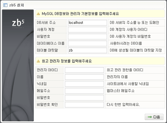 .zip 파일을 받아서 설치하는 방법은 제로보드 4 버전 설치 방법과 동일하니 앞 페이지를 참고하시기 바랍니다. |