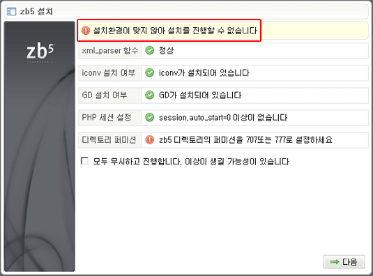 설치에 이상이 있을 경우 아래와 같은 페이지가 나올 수 있습니다. 아래와 같은 페이지가 나오면 느낌표 표시가 되어 있는 부분의 문제를 해결한 후 다시 설치를 하시기 바랍니다.