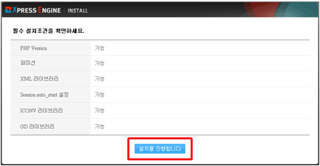 • 필수 설치조건 화면을 확인하실 수 있으며 모든 "가능"으로 표시가 되었다면 "설치를 진행합니다"를 클릭해 주십시오.