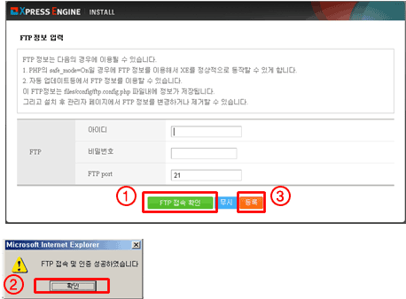 ② FTP 접속 및 인증 확인 성공 메시지가 나오면 "확인"버튼을 클릭해 주십시오.