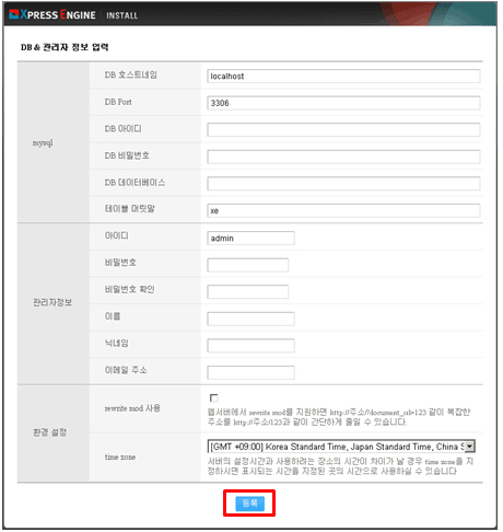 - 테이블 머릿말 : 기본 xe라고 되어 있는데 그냥두어도 상관없습니다.