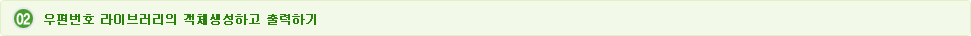 * 우편번호 라이브러리를 사용하여 우편번호 DB를 사용할 수 있습니다. 우편번호 라이브러리를 사용하기 위해서는 PHP 프로그래밍에 대한 기본 지식을 가지고 있어야 합니다.