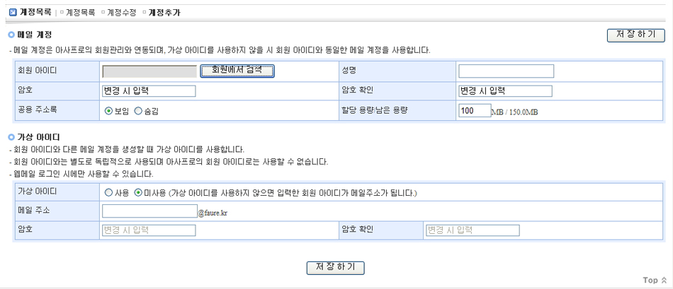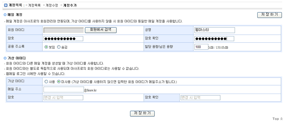 - 아사프로 회원과 연동하여 웹메일 계정 추가를 쉽게 할 수 있습니다.