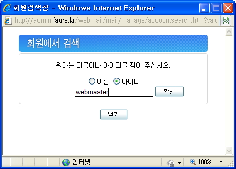 - 기존에 등록되어 있는 웹메일 계정에 대해 용량 변경, 암호 변경, 계정 삭제 등의 관리를 할 수 있습니다.