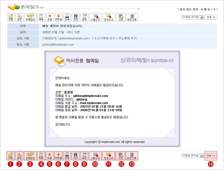 14) 이동 : 읽은 편지를 다른 편지함으로 이동할 때 사용합니다. |