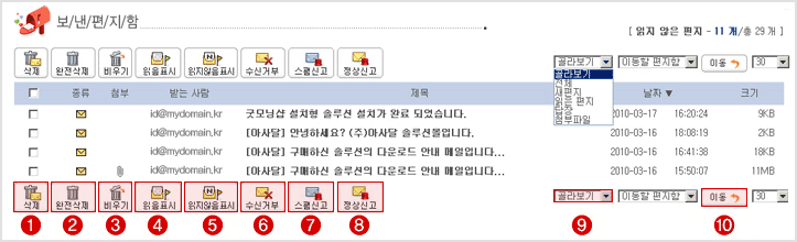 9) 골라보기 : 사용자가 원하는 메일 종류(새편지, 읽은편지, 답장, 첨부파일)만 선택해서 볼 수 있습니다.