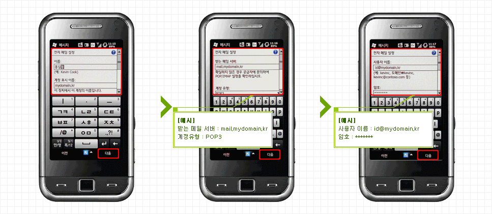 다음은 옴니아폰에서 웹메일 설정을 하는 방법입니다. |