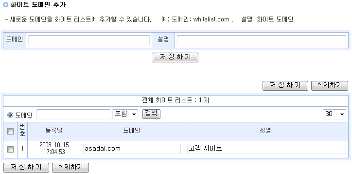 (1) 화이트도메인 : 특정 도메인에서 오는 메일을 스팸필터 서버를 거치지 않고 무조건 받을 수 있도록 설정할 수 있습니다. 도메인 부분에는 도메인명만 입력하실 수 있습니다.