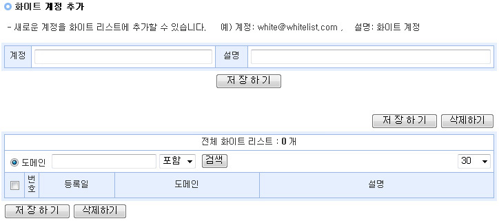 (2) 화이트계정 : 특정 계정(이메일 주소)에서 오는 메일을 스팸필터 서버를 거치지 않고 무조건 받을 수 있도록 설정할 수 있습니다. 계정 부분에는 이메일 주소만 입력하실 수 있습니다.