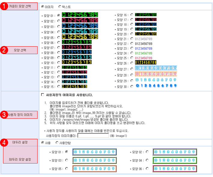 1. 카운터 모양 선택 : 카운터를 이미지로 쓸 것인지 텍스트로 쓸 것인지 설정할 수 있습니다.