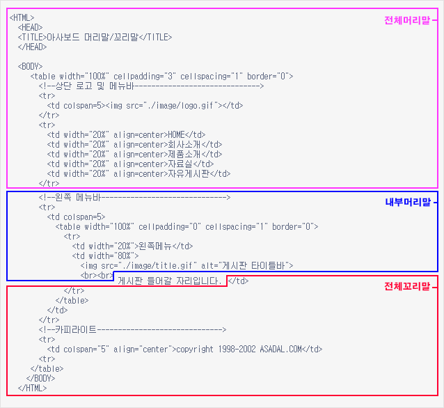 3. begin.htm 에는 전체머리말 부분을. end.htm 에는 전체꼬리말 부분을 넣어 원하시는 형태로 수정합니다.