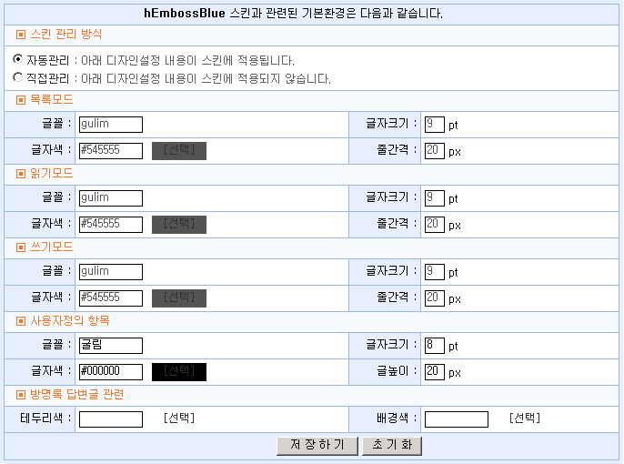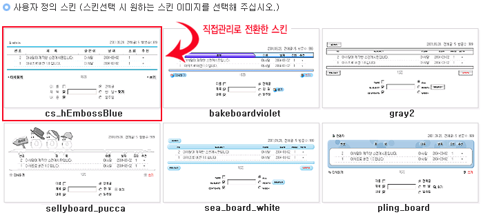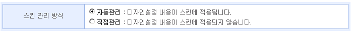 게시판이 스킨을 관리하던 자동관리 방식과 달리 HTML 파일과 이미지를 고객이 자유롭게 바꿀 수 있도록하는 스킨 관리 방식입니다.
