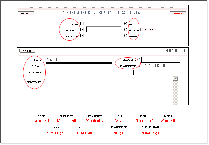 위 그림의 이름, 제목, 내용, 전체글, 한달, 일주일, 비밀번호, IP, 내용, 파일업로드의 이미지를 자신의 홈페이지에 맞게 변경합니다.