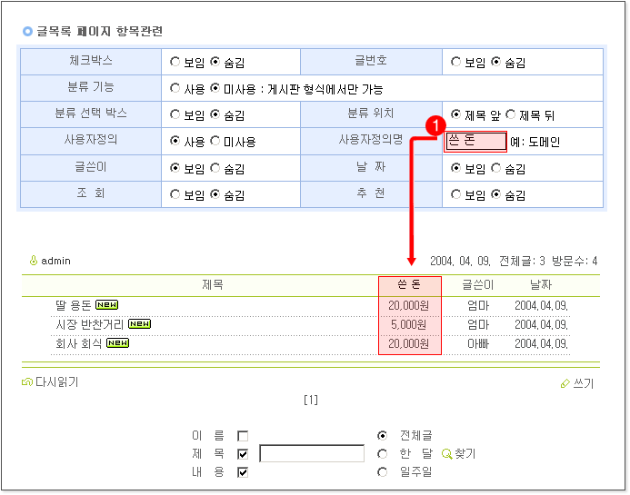2. 게시판 설정 사항에서 항목글꼴, 항목배경색, 글꼴, 테두리색 등을 선택합니다.