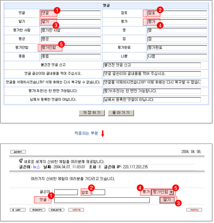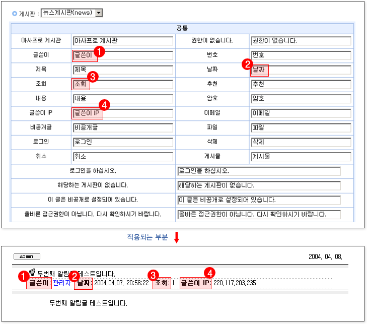 몇 가지 문구 변경부분을 예로 들었습니다. 게시판의 모든 문구는 변경이 가능합니다. |
