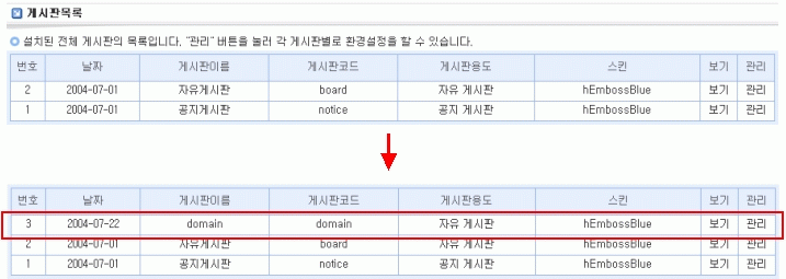 - 위 그림과 같이 처음에 board와 notice만 있던 게시판 목록에 domain게시판을 이전했을 경우 domain게시판이 추가된 것을 확인할 수 있습니다.