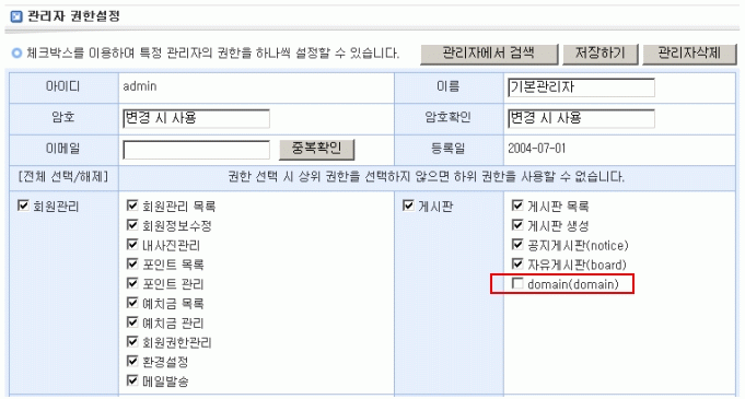 - 따라서 게시판 목록에서 해당 게시판의 관리를 클릭하면 "권한이 없습니다." 라고 나옵니다.