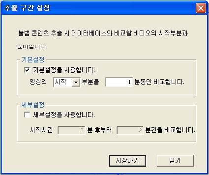 • 특징점 추출 시 데이터베이스와 비교할 비디오의 시작부분과 비교 시간을 설정합니다.