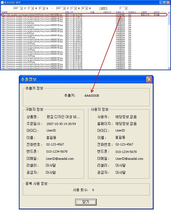 핑거프린트가 발견된 이미지의 경우 구매자 정보를 확인할 수 있습니다.