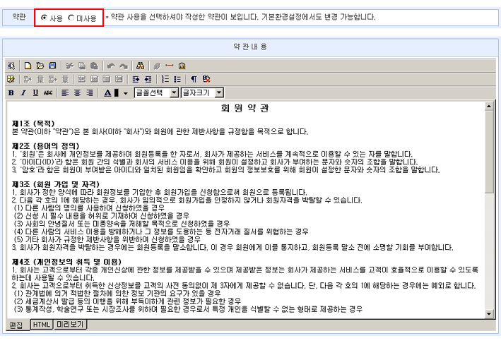 회원가입 시에 사용할 약관 내용을 편집할 수 있습니다. 약관 사용 여부는 기본환경설정에서도 변경 가능합니다