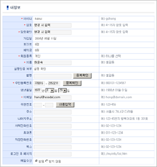 회원가입 폼입니다. 회원가입에 필요한 항목을 관리자 화면의 회원관리>가입폼관리에서 자유롭게 추가, 삭제할 수 있으며 항목 순서 지정도 가능합니다. 그리고 각 항목을 필수로 받을 것인지 선택으로 받을 것인지도 관리자화면에서 지정할 수 있어 매우 편리합니다.