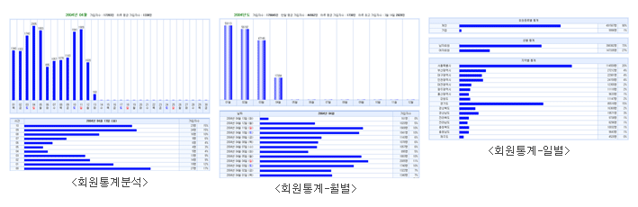 회원통계보기에서는 월별, 연별통계 외에도 회원통계분석에서 회원종류별, 성별, 지역별, 연령별 통계보기가 가능합니다.