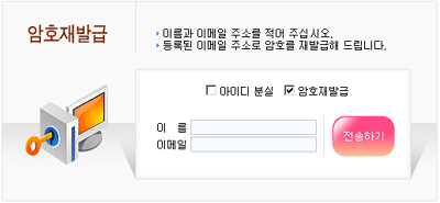 암호분실 시 사용하는 기능으로 암호를 다른 것으로 바꾸어 회원이 가입한 메일로 발송해 줍니다. 이 때, 메일 주소는 가입 당시의 이메일 주소를 사용하셔야만 암호를 받아보실 수 있습니다. 회원가입 시 암호는 보안을 위해 암호화되어 저장됩니다.