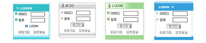 약 10여가지의 로그인창 스킨이 기본 제공되며 사이트의 각 페이지별 디자인에 맞추어 한 사이트에 여러 가지 종류의 로그인창을 사용할 수 있습니다. 또한 관리자가 스킨의 모양이나 색을 마음대로 변경할 수 있습니다.