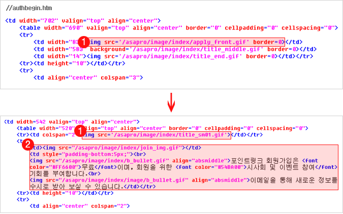 • 타사이트 회원가입 사용 시 : 머리말 /asapro/member/addonbegin.htm      꼬리말 : /asapro/member/addonoend.htm