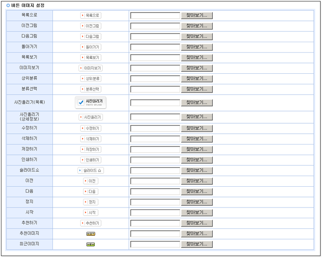 7. 내부 END : 상위 분류생성 시 생기는 디렉토리안의 영문분류명 안에 end.htm 사용 여부를 설정할 수 있습니다. 사진관리가 여러 개인 경우, "꼬리말"에 들어갈 내용 중 Copyright 등 공통적인 부분을 따로 떼어서 end.htm 파일에 넣으십시오. 홈페이지 수정 및 관리가 훨씬 편리해집니다.
