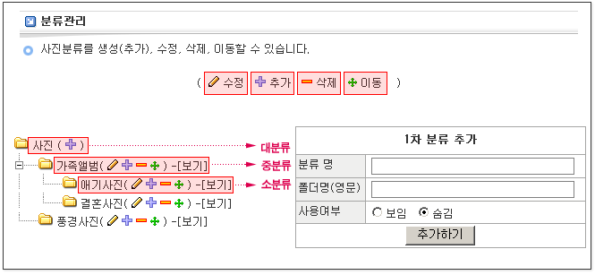 - 대분류, 중분류, 소분류 등 원하는 분류를 마음대로 생성할 수 있어 많은 앨범을 관리할 때 편리하게 관리할 수 있습니다.