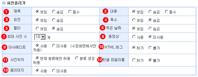 4. 사진올리기 : 사진 올리기를 숨기거나 보일 수 있습니다.
