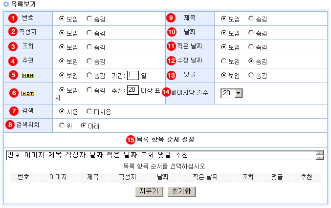 15. 목록 항목 순서 조절 : 목록의 항목의 순서를 조절할 수 있습니다. 항목 조정 시 아래의 지우기 버튼을 클릭하시고 목록의 순서를 정해 주시면 됩니다.