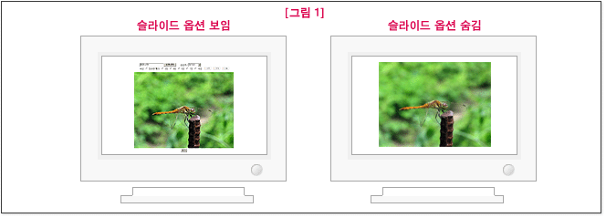4. 슬라이드 옵션 : 슬라이드 옵션을 정할 수 있습니다. 아래 [그림 1]의 보임과 숨김의 예입니다.