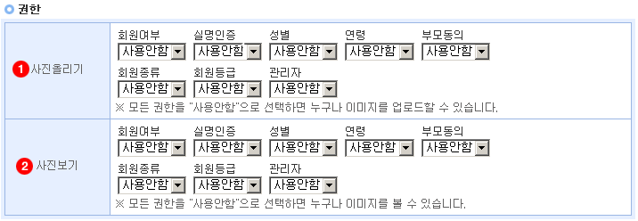 1. 사진올리기 : 사진올리기 권한을 선택할 수 있습니다. 권한의 설정은 회원관리프로그램에서 변경하십시오