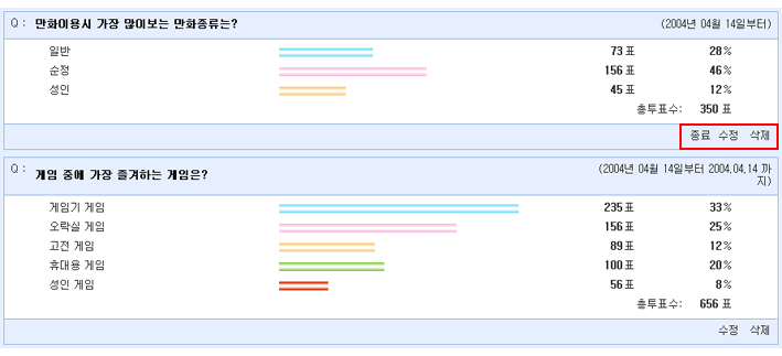 등록된 설문조사의 투표결과를 볼 수 있으며 종료, 수정, 삭제가 가능합니다.