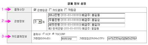 - 기본설정의 제일 밑 부분에 결제 정보 설정이 있습니다. 3번 카드결제정보 부분에 발급받은 가맹점 아이디와 가맹점접근키를 넣습니다.