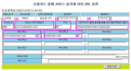 ※ Return URL, Ref URL1,2..는 도메인명 외에 다른 것이 들어가면 제대로 동작안할 수 있습니다. 예) mydomain.com(O), www.mydomain.com(O), www.mydomin.com/AsaMall(X) |
