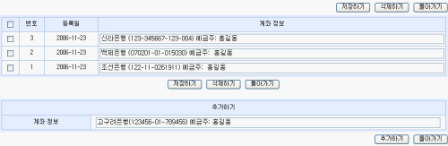은행입금 관리를 클릭하면 아래와 같은 페이지를 볼 수 있습니다. 은행계좌번호를 추가/수정/삭제할 수 있습니다.
