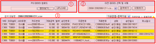 - 중복자료: 중복자료란 결제모듈의 로그에는 한 번 입력이 되었으나 실제 PG사에는 두 번 결제된 자료로 주로 PG사의 오류로 발생합니다. 배경색이 노란색으로 표시됩니다.
